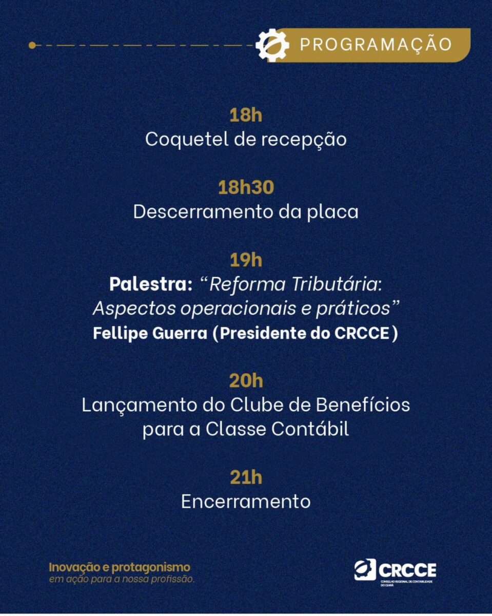 A programação inicia com um coquetel de recepção, seguido do descerramento da placa às 18h30. Às 19h, será realizada a palestra “Reforma Tributária: Aspectos operacionais e práticos”, ministrada por Fellipe Guerra, presidente do CRC-CE. Na sequência, às 20h, será lançado o Clube de Benefícios para a Classe Contábil, encerrando a programação às 21h.